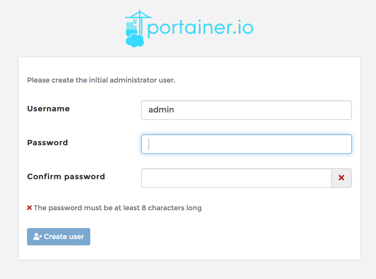 The first time you go to the Portainer page, you will be presented with the message "Please create the initial administrator user.". Fill in your preferred admin username and password. Click