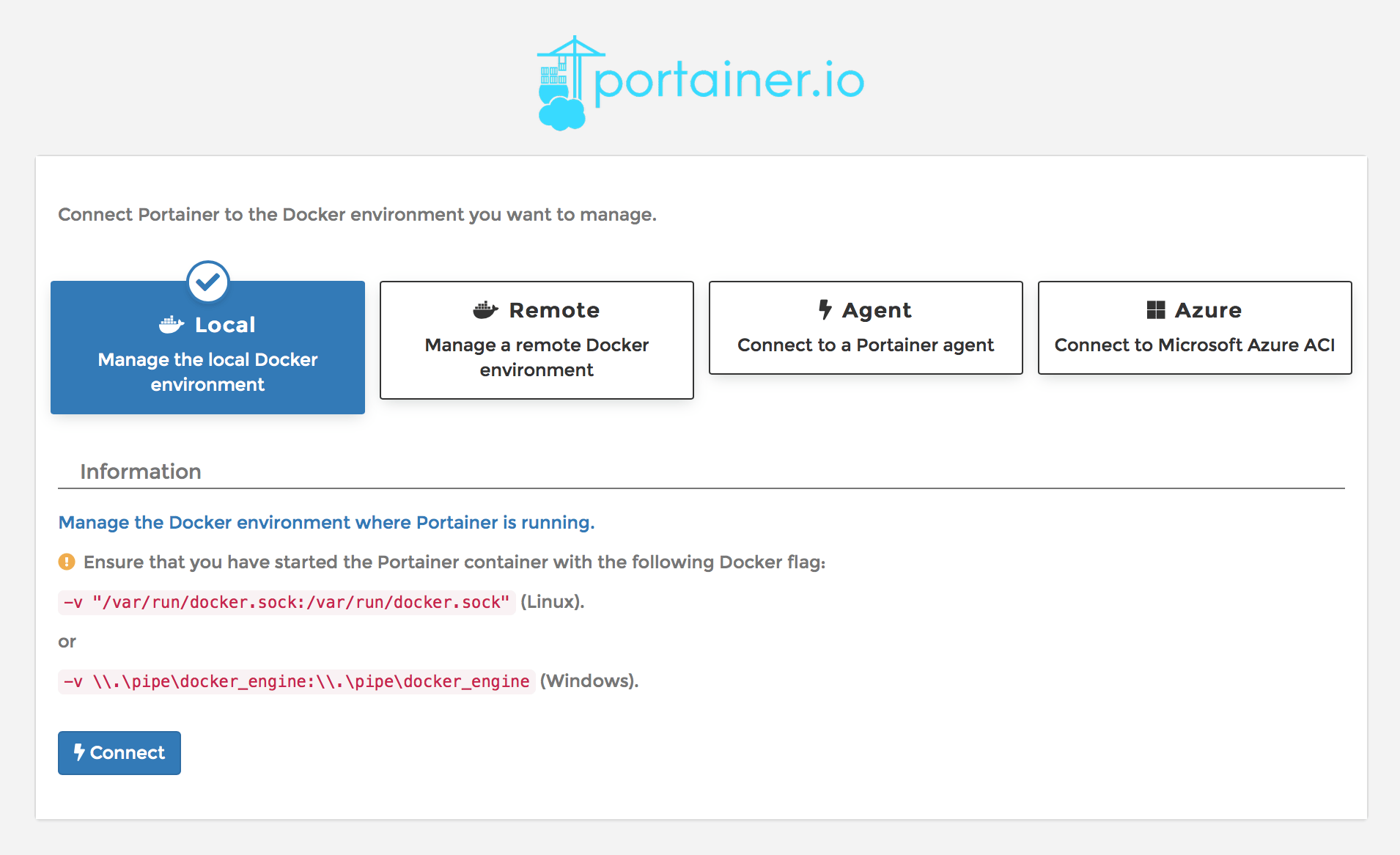 On the "Connect Portainer to the Docker environment you want to manage." screen, select