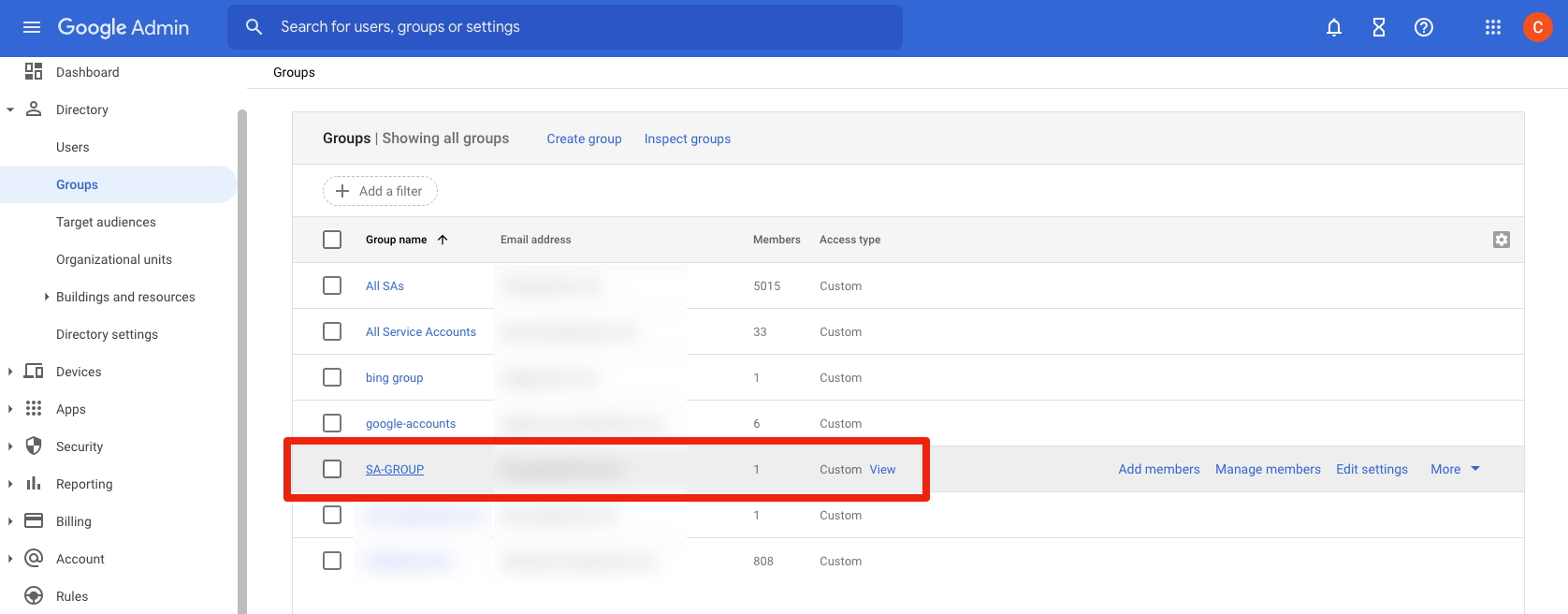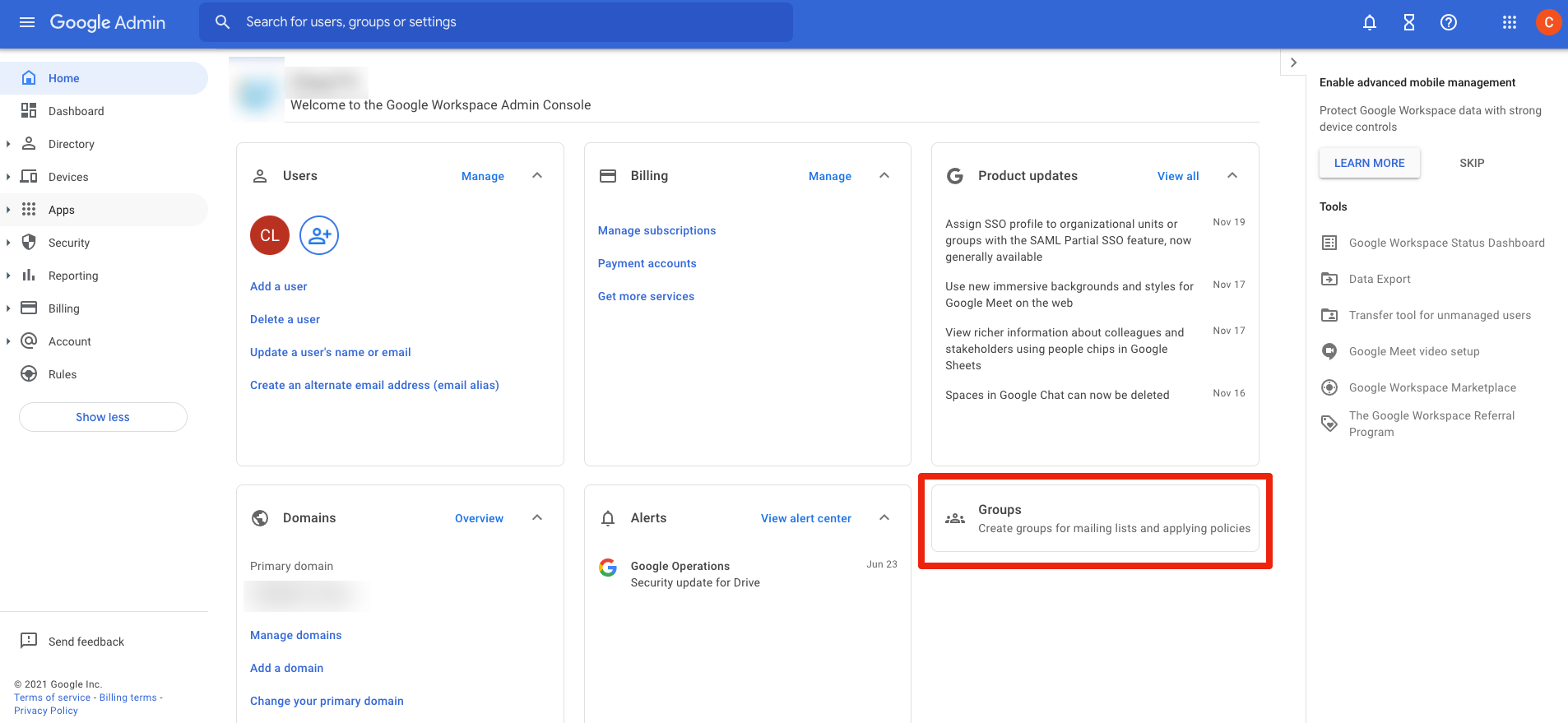 Open the Google Admin site: https://admin.google.com/ and login with your Google account. Click on the groups heading: